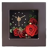 上品なブラウンフレームに赤いプリザーブドフラワーを配した IPFA プリザーブドフラワー 置き時計は、時を刻む時計と枯れない花の両方を兼ね備えたギフト。