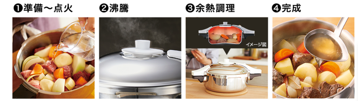- 加圧後すぐに火を止めて余熱で調理を進める「0分料理」が可能